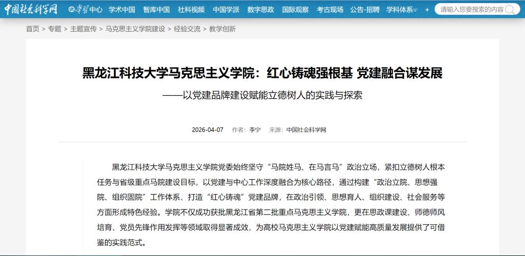 4月7日,中国社会科学网以专题形式刊发我校马克思主义学院“红心铸魂强根基 党建融合谋发展——以党建品牌建设赋能立德树人的实践与探索”党建工作经验做法,全面推介“红心铸魂”党建品牌在党建与业务融合、红色基因传承等方面的创新实践与显著成效,引发广泛关注。现将全文转发,以便学习交流。