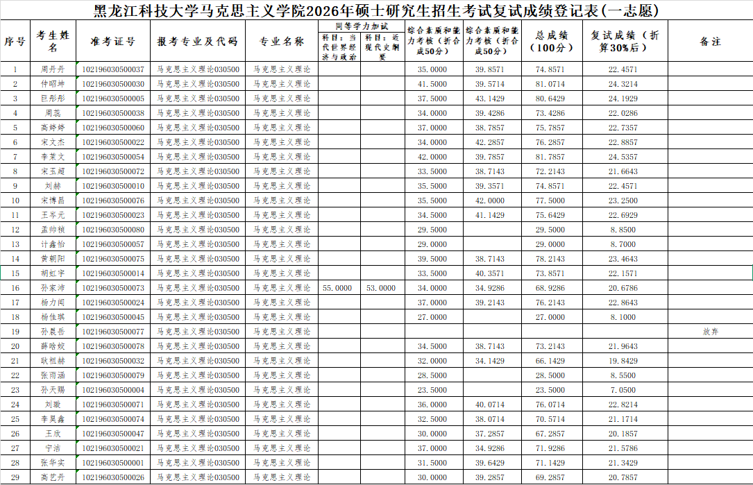 黑龙江科技大学马克思主义学院2026年硕士研究生招生考试复试成绩登记表(一志愿)